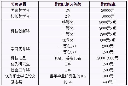 硕士生基础奖学金分为一等奖和二等奖两个等级。一等奖每人每年8000 元,二等奖每人每年4000 元;在此基础上,每人每月700 元,另外导师资助每人每月100—200 元。即:基础奖学金一等奖每人每年不低于16400元;二等奖每人每年不低于12400元。