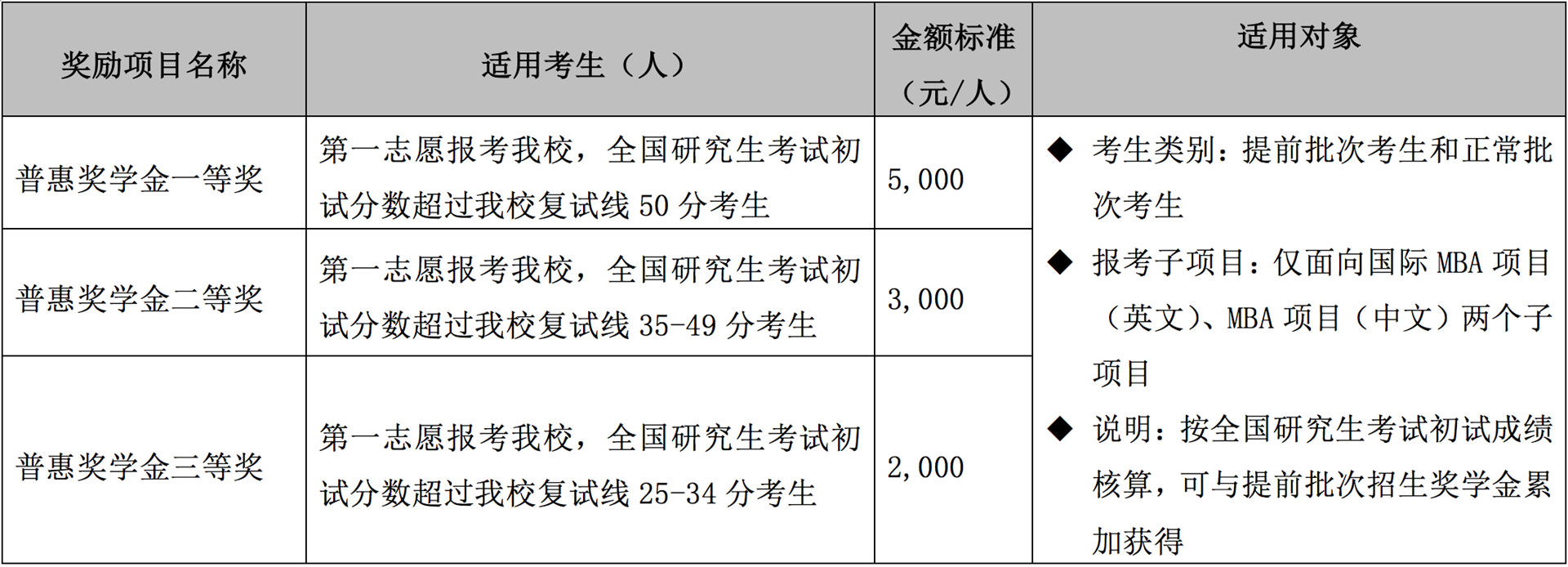 设立四种类别入学奖学金,以资鼓励报考我校MBA/EMBA项目、全国研究生考试初试分数成绩优秀、提前批次招生面试表现出色的考生。
