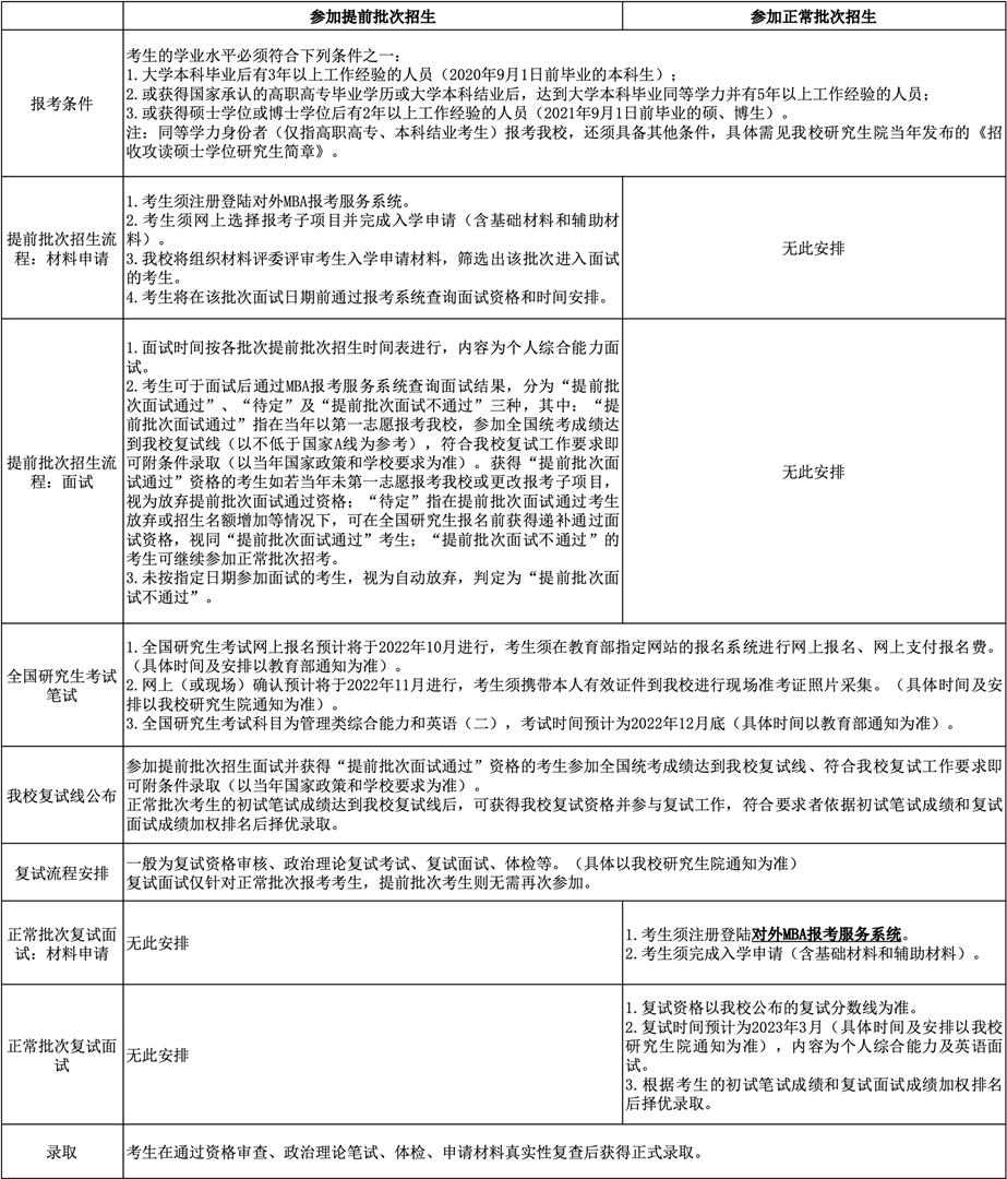 4.“MBA提前批次招生”将安排于2023年6月至10月进行,参加提前批次招生的考生须在全国研究生考试报名前的指定期间内在线提交申请材料,经过材料评审,择优给予面试资格;经过面试环节择优给予综合素质优秀的考生“提前批次面试通过”资格;原则上,参加提前批次招生面试并获得“提前批次面试通过”资格的考生参加全国统考成绩达到我校复试线(以不低于国家A线为参考),符合我校复试工作要求即可附条件录取(以当年国家政策和学校要求为准)。获得“提前批次面试通过”资格的考生如若当年未第一志愿报考我校或更改报考子项目,视为放弃提前批次面试通过资格。